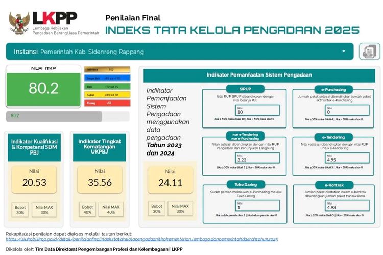 Beritasidrap.com – Kabupaten Sidenreng Rappang (Sidrap) mencatatkan capaian membanggakan di tingkat Provinsi Sulawesi Selatan dalam penilaian Indeks Tata Kelola Pengadaan (ITKP) Final Tahun 2025.