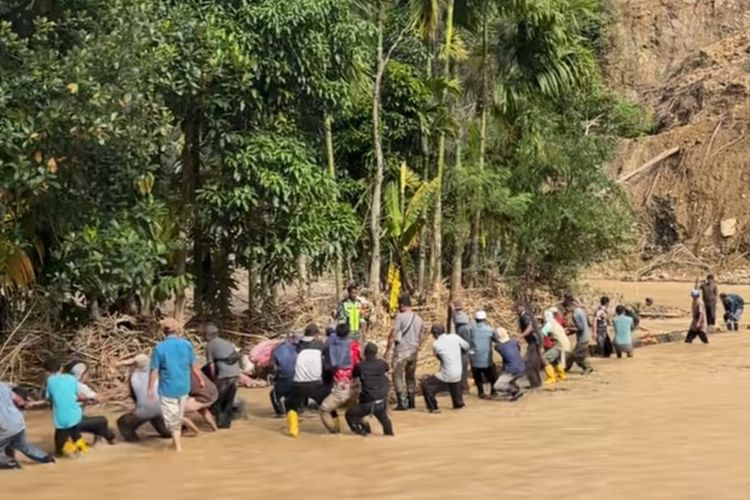 Rekaman tersebut memperlihatkan puluhan warga bahu-membahu mengangkat batang kayu berukuran besar, menyusunnya perlahan di atas aliran air yang sebelumnya menghancurkan jalur penghubung desa.