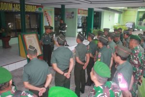 Sidrap, Beritasidrap.com — Kasdim 1420/Sidrap Mayor Arm Arie Widarto, SIP., pimpin apel pagi anggota Kodim 1420/Sidrap di depan Aula Makodim Jalan Jenderal